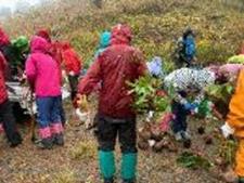 ・雨風の中、急斜面をよじ登り 鎌で下草を刈り 鍬で土を掘り起し 様々な樹木の苗を植えました。ドロドロになりましたが、何故か充足感でいっぱい。ちょっとは山への恩返しが出来たかな?