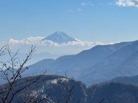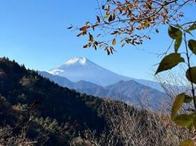 秋晴れで絶好の山日和。車窓から富士山も見え、自然とテンションが上がる。9時に田野倉駅に集合し、なだらかな道を15分ほど進むと、九鬼山登山口に到着。樹林帯に入ると急に気温が下がり、秋も終盤と感じる。落ち葉を踏みながら急登を登っていくと、ところどころで陽の光に輝いた紅葉が出迎えてくれる。すっかり葉を落とした木々も潔く、清々しい。すれ違う人も少なく、静かな山歩きを楽しめた。2時間も歩くと九鬼山山頂。山頂からは雲取山など北側の稜線がとてもきれいに見渡せた。