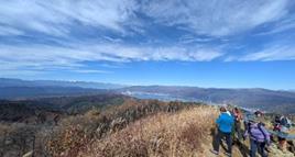 予定より出発は遅れましたが、皆さん順調な足取りで、通過ポイントの水場に到着。水は枯れていたので自分のペットボトルの水を飲む。まもなくして今度は展望ポイントへ。日向山の白いビーチの後ろに鳳凰三山、更に後ろに富士山、右の方には甲斐駒ヶ岳、鋸岳も見えました。山頂でも富士山を眺めながらお昼を食べて落ち葉カサカサの道を下りました。晩秋と初冬を感じるハイキングでした。CL、SL、運転手、参加の皆様 ありがとうございました。