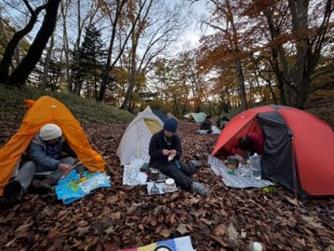 久々の晴れ予報の土曜日、混雑を予測して甲斐大和駅からタクシー利用で登山口のあるすずらん昆虫館へ。道路を挟んで向かい側に登山口があり、登って5分程度のところに綺麗なトイレがあります。多少の急登もありますが、赤や黄色に色づいた広葉樹林の中を心地よく歩くことができました。2時間程度登ると甲州アルプスと名の付く稜線上に出ます。稜線上は風が強く皆で雨具等を着て防寒対策。薄曇りでしたが富士山・白根三山は冠雪しており八ヶ岳もクッキリと大展望でした。小金沢山を過ぎると多少岩稜帯でしたが笹原の展望の良い尾根道が続き大菩薩峠に着きました。介山荘でトイレ休憩をとりテン場のある福ちゃん荘に到着。テン場は平で石もなく水場もありトイレも綺麗で満足。テント慣れしているCLの力も借りて無事テントで眠ることができました。夜中2時近くにトイレへ行き空を見上げると鮮明に沢山の星が煌めいており感動しました。
