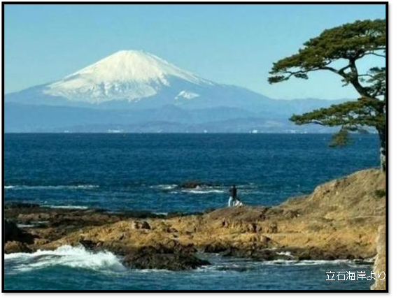 12時、真鶴駅からなごやかなウォーキングを開始。住宅街を抜けて高台から海を眺めながら岬に向かう。真鶴三石海岸では波打ち際で少しスリリングな歩道歩きを楽しむ。真鶴半島の先端にある三ツ石を眺めながら一休みして記念撮影。三ツ石とは、海中にそびえる三つの大きな岩が沖合に浮かぶように並ぶ景勝地で、初日の出の名所とのこと。是非元日に訪れてみたい。